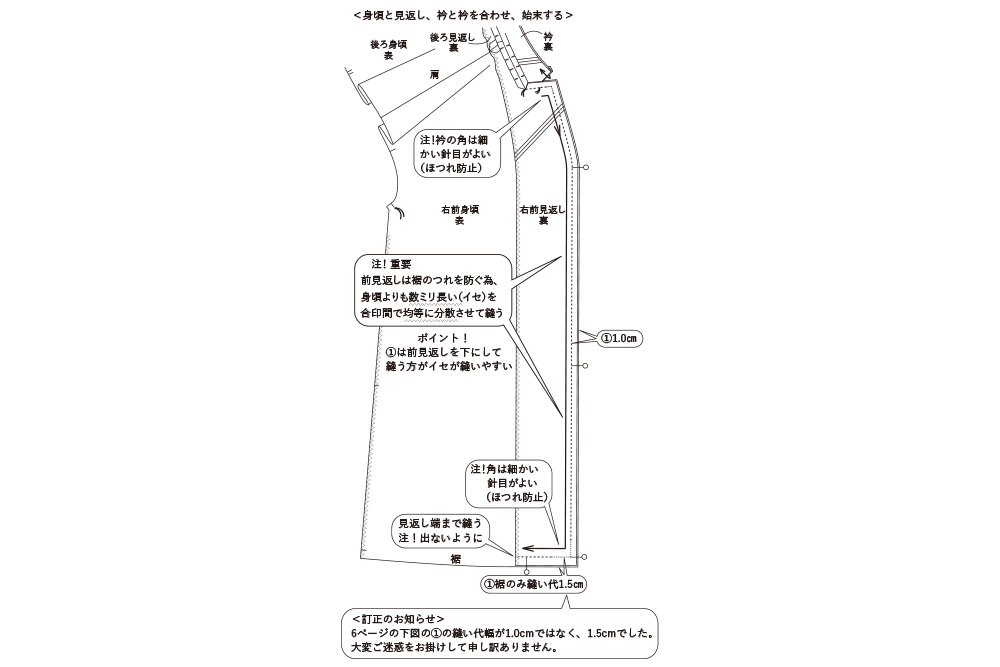 4ページ右下の「拡大図」の「⑦縫い目から後ろ身頃側に倒す」という説明ですが、正しくは「⑦縫い目から前見頃側に倒す」でした。同時に吹き出し内のイラストも間違っておりました。