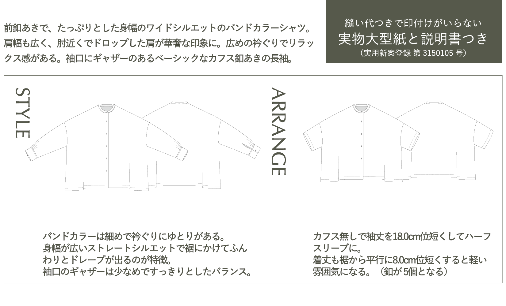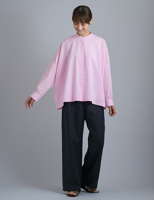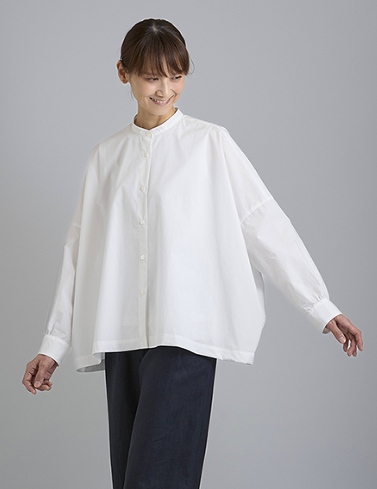前釦あきで、たっぷりとした身幅のワイドストレートシルエットで柔らかい印象のバンドカラーシャツです。