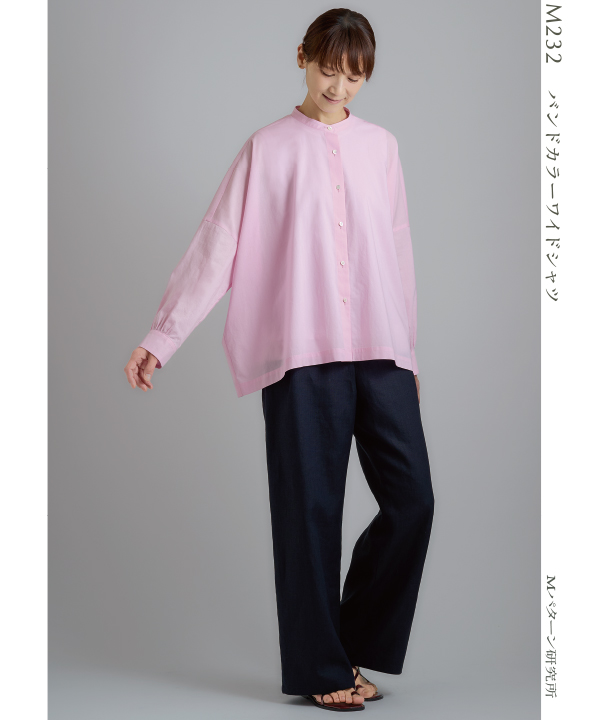 前釦あきで、たっぷりとした身幅のワイドストレートシルエットで柔らかい印象のバンドカラーシャツです。