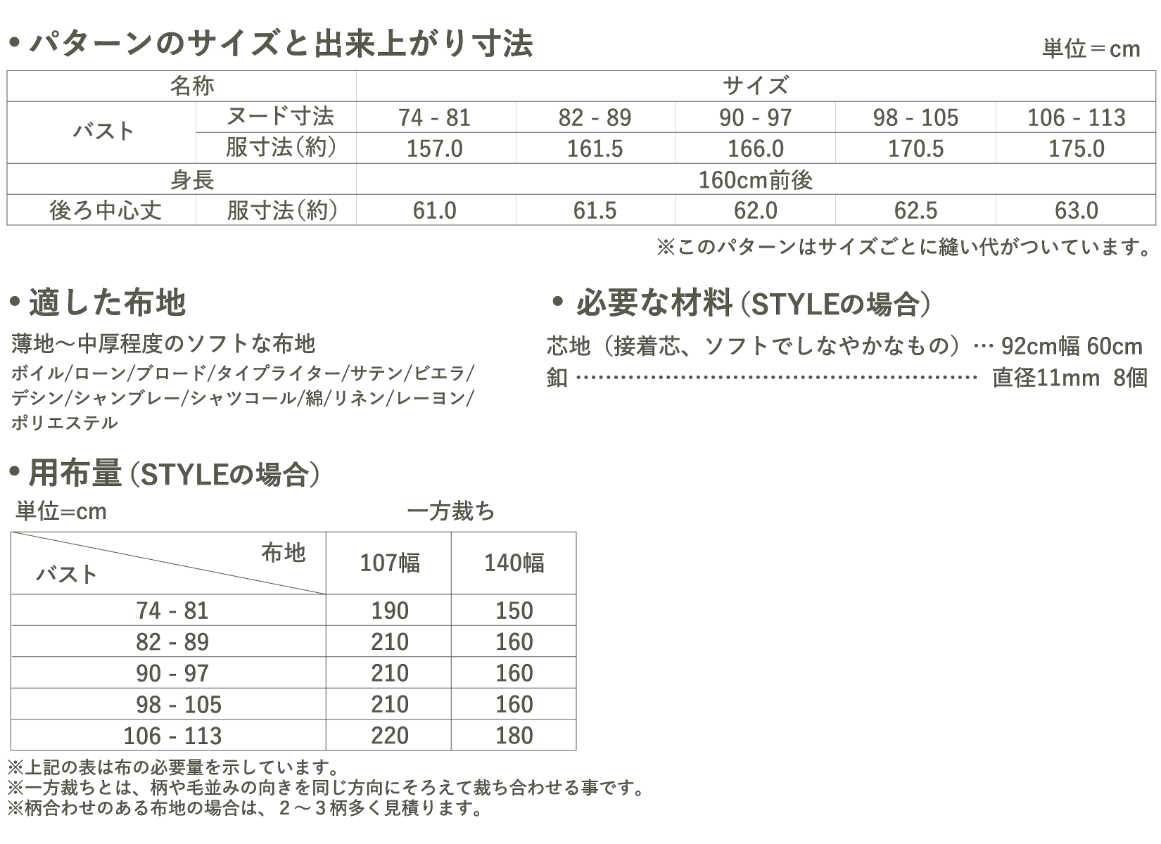 ●この商品は、ネット販売しておりますパターンと違い、1~3枚の紙に複数のサイズが印刷された実物大のパターンです。お客様ご自身でサイズを決定して頂き、パターンをカットしてご使用下さい。