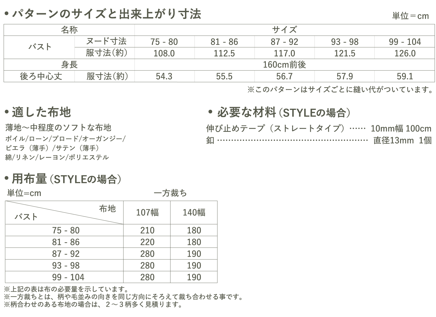 ●この商品は、ネット販売しておりますパターンと違い、1~3枚の紙に複数のサイズが印刷された実物大のパターンです。お客様ご自身でサイズを決定して頂き、パターンをカットしてご使用下さい。