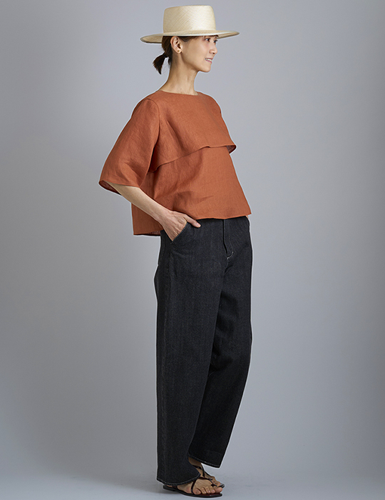 リネンのハリ感でフレアーがしっかりと出つつ、リネンの特性で硬さのない、しなやかなシルエットになりました。